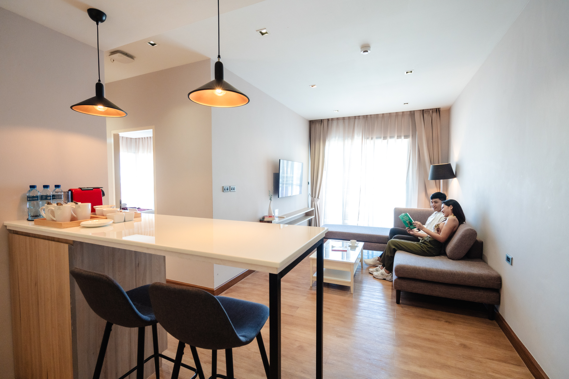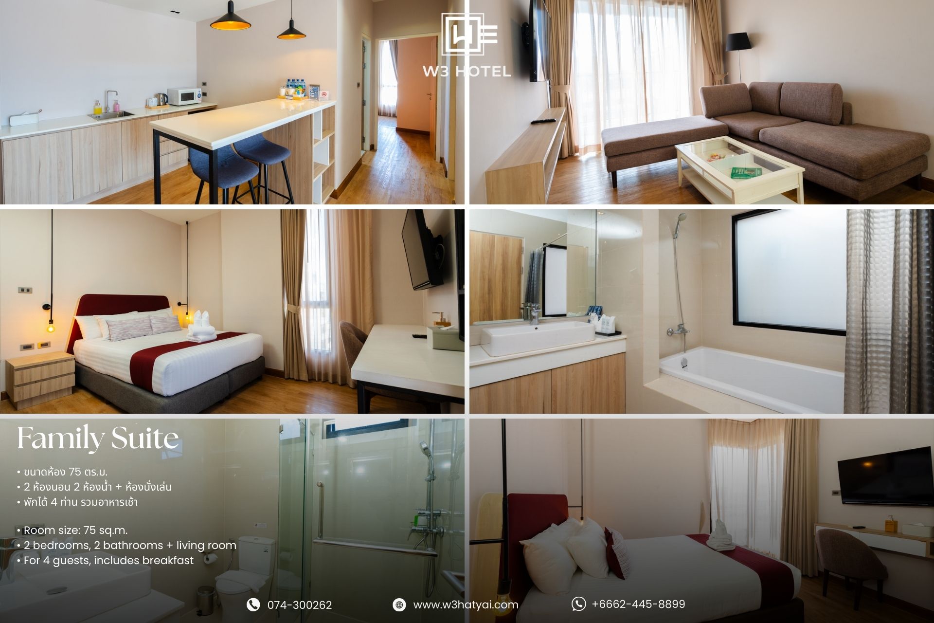 Family suite A 75 Sq.m. room with 2 bedrooms and 1 living room. Enjoy family time with panoramic pool views and Kho Hong mountain, the iconic beauty of Hatyai. Room Facilities LED TV 50" 2 LED TV 40" WIFI Bathtub Minibar Hairdryer Breakfast Microwave Microwave